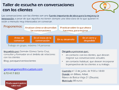 He creado un taller para analizar y practicar sobre el modo como conversamos con nuestros clientes. Será el 12 de junio en Bilbao, en Arbat. La idea es organizar un grupo no muy grande hasta 14 personas, para trabajar sobre las conversaciones con los clientes: lo que hacemos y decimos antes de, en el inicio, durante y al finalizar espacios de dialogo con las personas que son el foco de nuestra actividad.